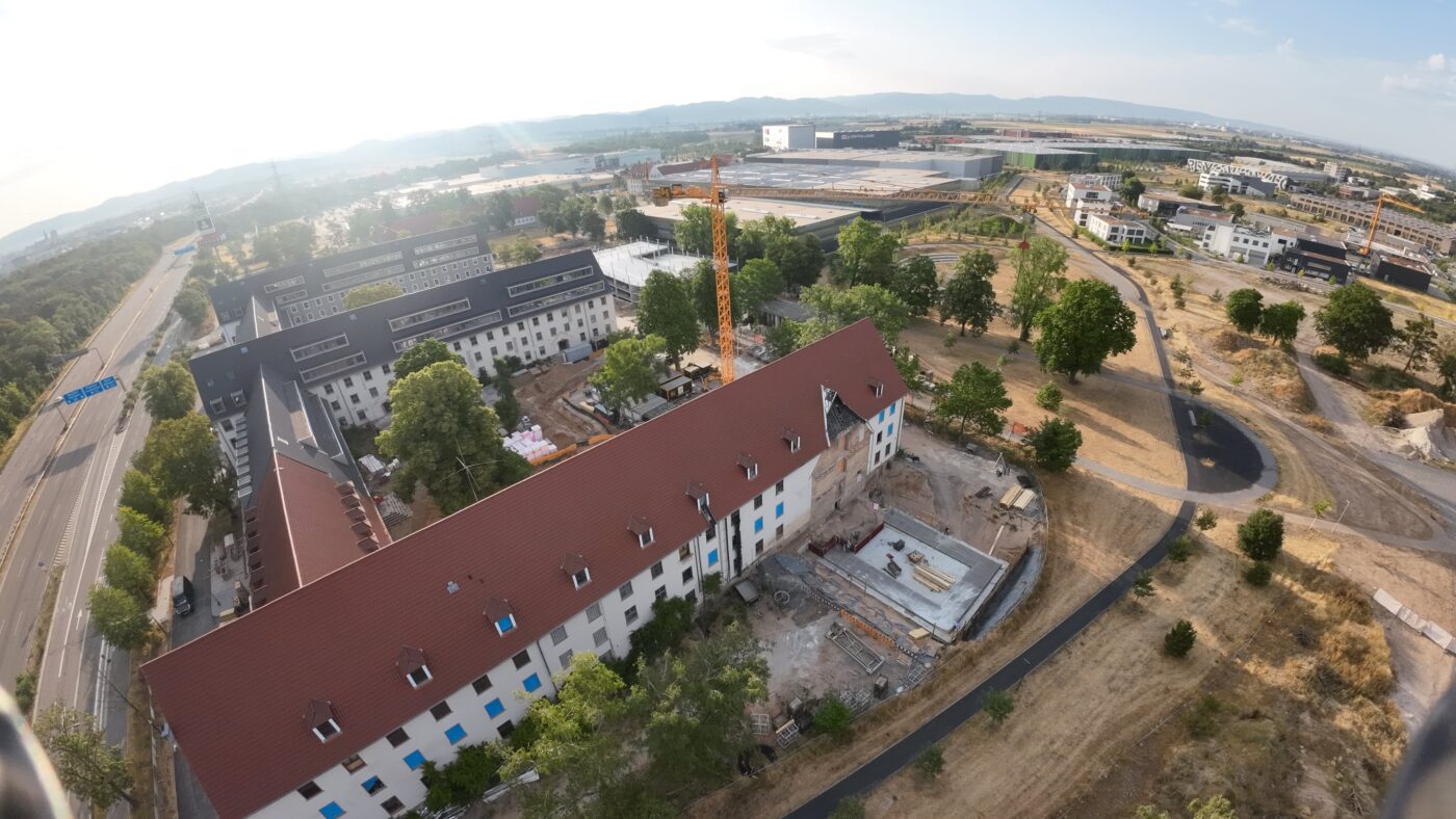 Ein ehemaliges Kasernengebäude, das nun ein Teil des Green Business Parks Mannheim ist, wandelt sich zu einem Ort für neue Arbeitswelten. Es entstehen loftartige Büros und ein Hotel mit 144 Zimmern durch Neu-Interpretation der baulichen Substanz des Gebäudes, das aus der Luft betrachtet die Form des Buchstaben E aufweist.