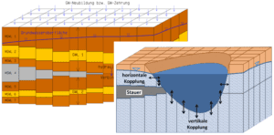 Prinzipdarstellung eines Grundwassermodells (links) und die Berücksichtigung von Seen (rechts)