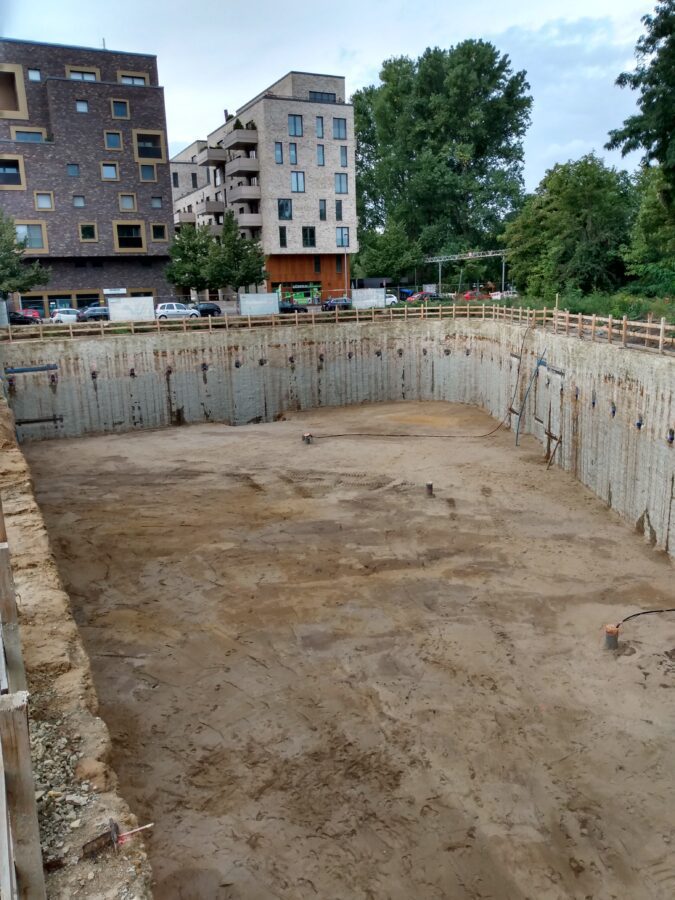 Due to the narrow space conditions and the depth of the excavation pits, the excavation pit was secured with a mixed-in-place shoring wall (MIP) from Bauer. The shoring wall was tied back, and two anchor levels were necessary in the area of the car lifts. The chalk clay formed the lower pit seal. The shoring wall with a length of approx. 20 m was embedded at least 2.0 m into the groundwater dam, the chalk clay. In this way, the water ingress was reduced to a minimum compared to a horizontal sealing. Residual water retention was ensured with the help of 10 wells.