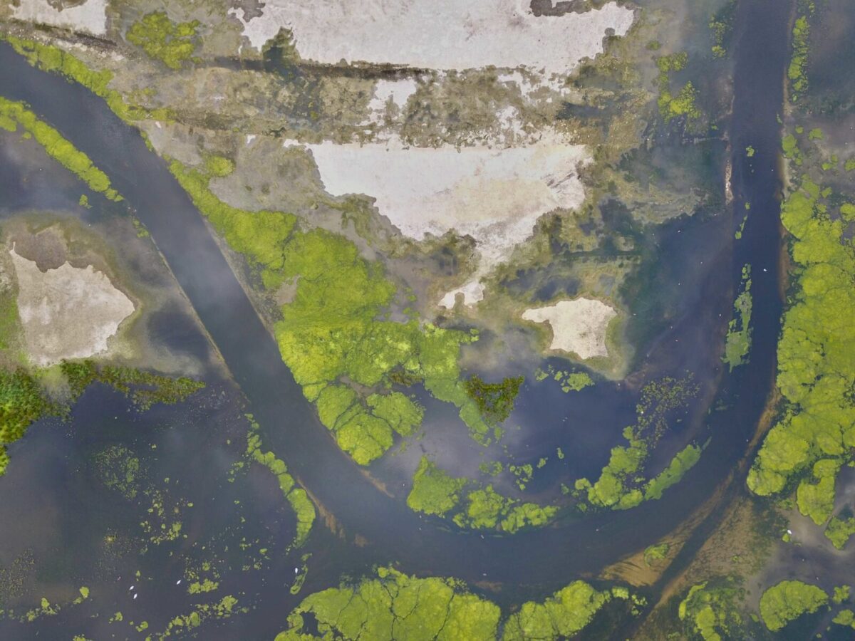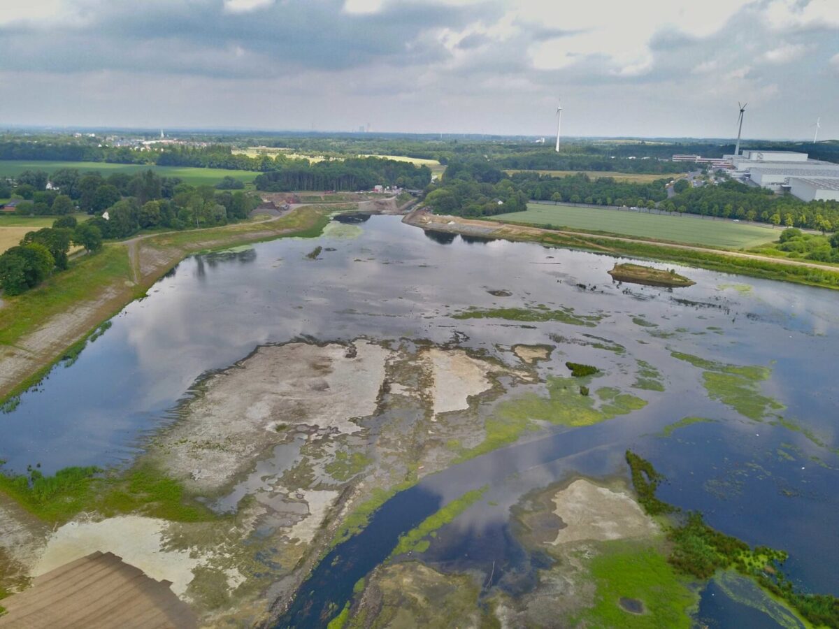 The Emscher, which was straightened during the industrialisation process, will meander through the basin in the course of the final development by digging a new river bed. Alternating between low and high discharge rates of the Emscher, the retention basin takes on a floodplain-like character.