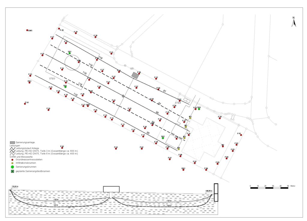 Mit diesen Informationen wurde eine Sanierungsanlage von MuP Umwelttechnik zur Boden- und Grundwasserreinigung geplant, gebaut und betrieben. Aufgrund der örtlichen Begebenheiten entschied man sich für eine hydraulisch-biologische in-situ Sanierung mit horizontalen Infiltrations- und Absaugleitungen sowie Vertikalbrunnen. Es wurden 4 Sanierungsbrunnen und 7 parallel verlaufende Absaugleitungen an die Anlage angeschlossen und insgesamt etwa 1,5 km Rohrleitungen ebenso wie 2,3 km Versorgungs- und Kommunikationsleitungen auf dem gesamten Gelände unterirdisch verlegt. Die Sanierung dauerte insgesamt 17 Jahre. Von 2004 bis zum Erreichen der Sanierungszielwerte im Jahr 2021.