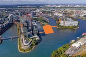 Im Hafenbecken entsteht ein architektonisches Prunkstück der ingenhoven architects, Düsseldorf. Auf mehr als 180 Pfählen, die bis 20 m in die Gewässersohle gebohrt werden, soll das neue Bauwerk gegründet werden. Hinzu kommen 3 Brücken, die den Zugang ermöglichen. Weiterhin soll die Möglichkeit bestehen, wasserseitig das Gebäude zu erreichen.