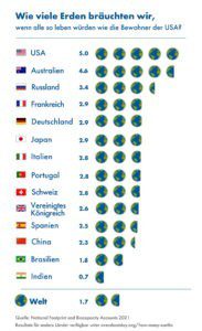 Zur Verdeutlichung die nachstehende Aufstellung der benötigten Erden für einzelne Länder und den gesamten Planeten.