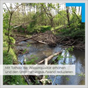 Durch die Wasserrahmen Richtlinie und die dadurch erhöhten Anforderungen an die Qualität von Fließgewässern vollzieht sich inzwischen ein Wandel, sodass vielerorts wieder mehr Totholz in die Fließgewässer eingebracht oder in diesen belassen wird.